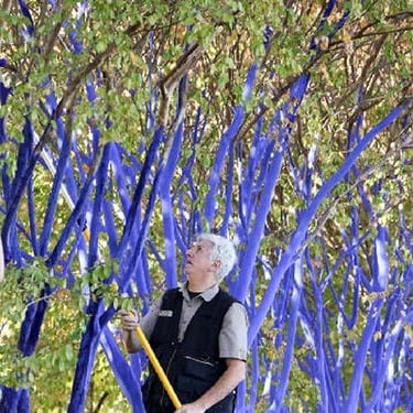 The Blue Trees, an ongoing environmental art installation about deforestation where the artist uses a vibrant blue to temporarily transform living trees into a surreal environment. The Purple Rain is a textual and visual response to homelessness; and his light works continue this thematic exploration of social issues using a commercial advertising medium.